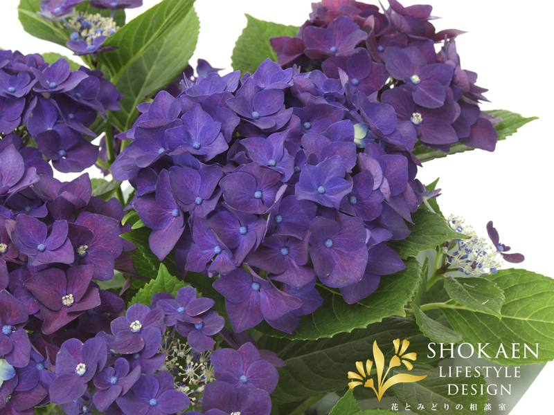 一重てまり咲きのアジサイの品種で、花弁が厚く水の蒸散によく耐えるため室内でも水の管理をしっかり行うことで