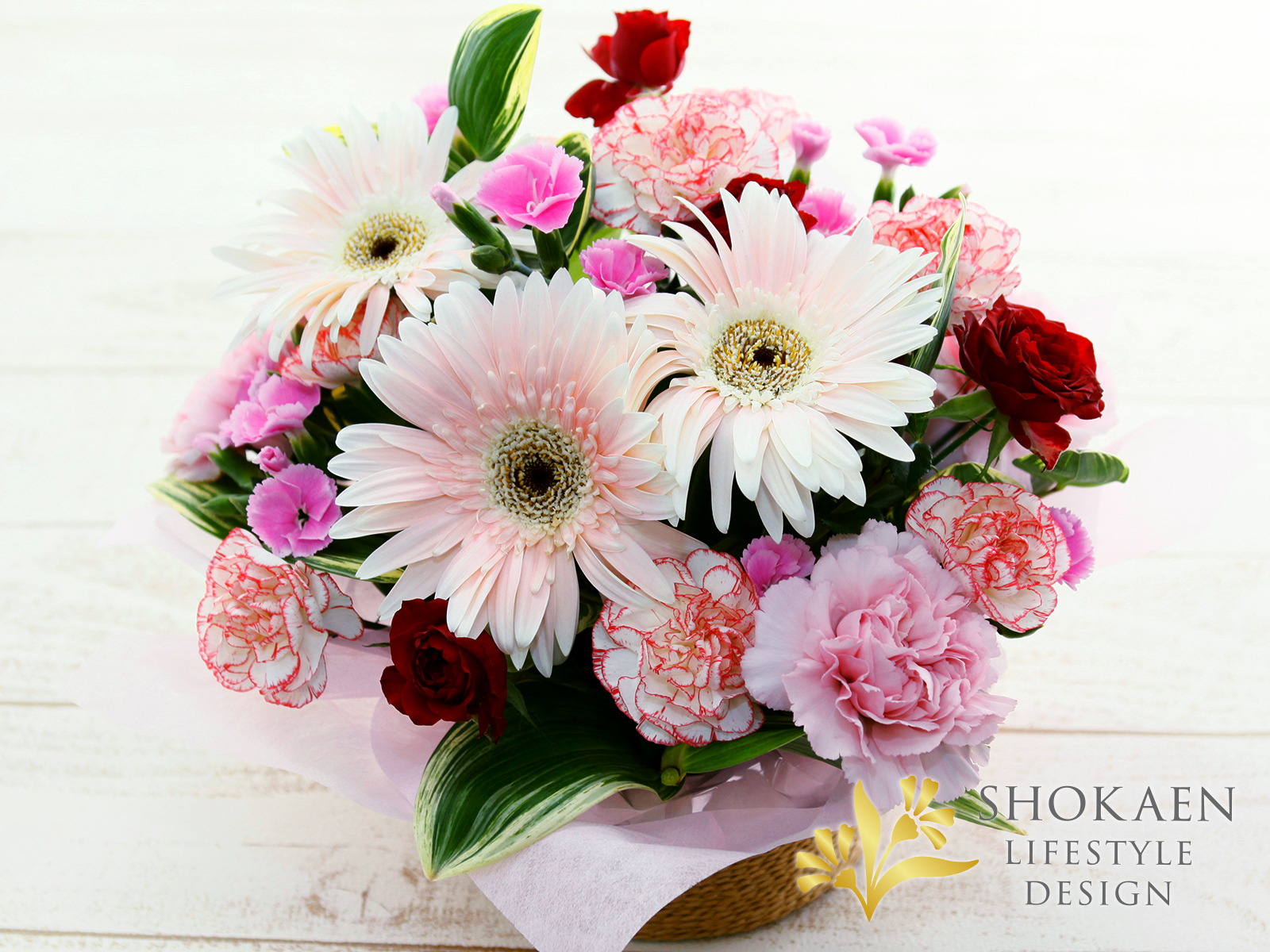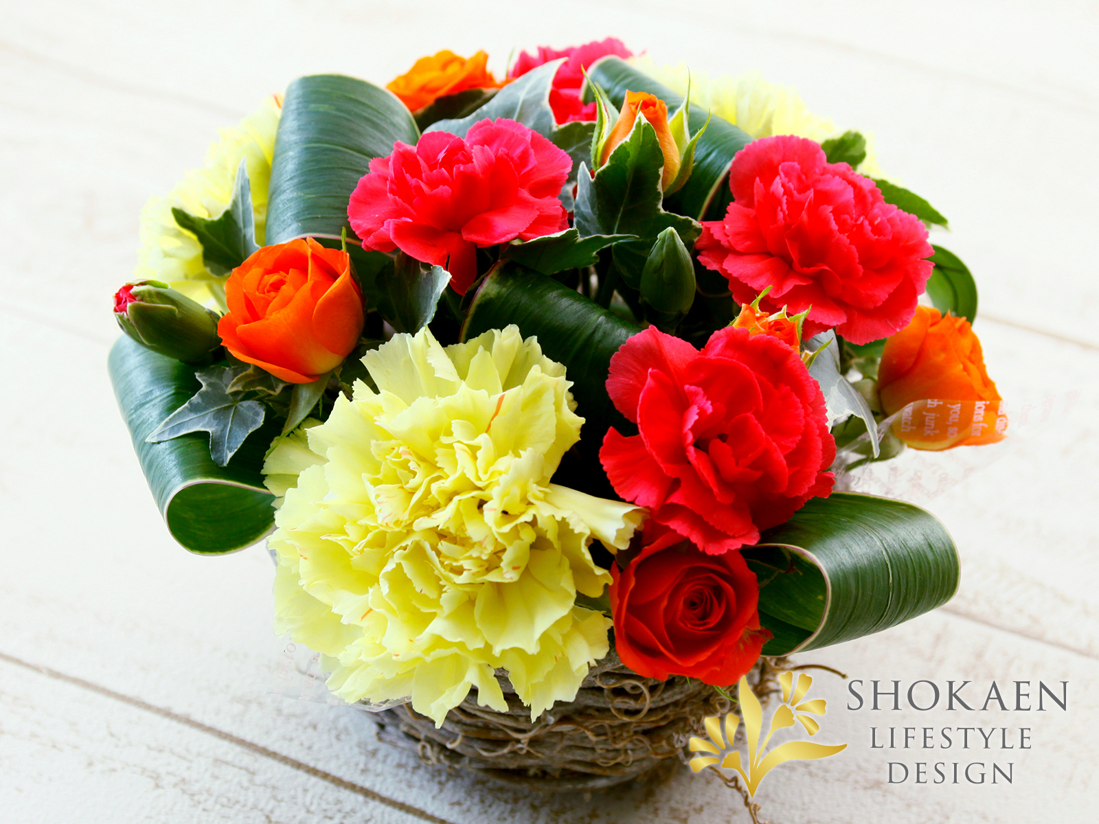 - 【石川県金沢市の花屋-正花園オリジナル】カーネーションをメインに明るい季節の小花を織り込んで仕上げました。温かみがあって色合いが強く小さいながらもとてもインパクトのある作品です。