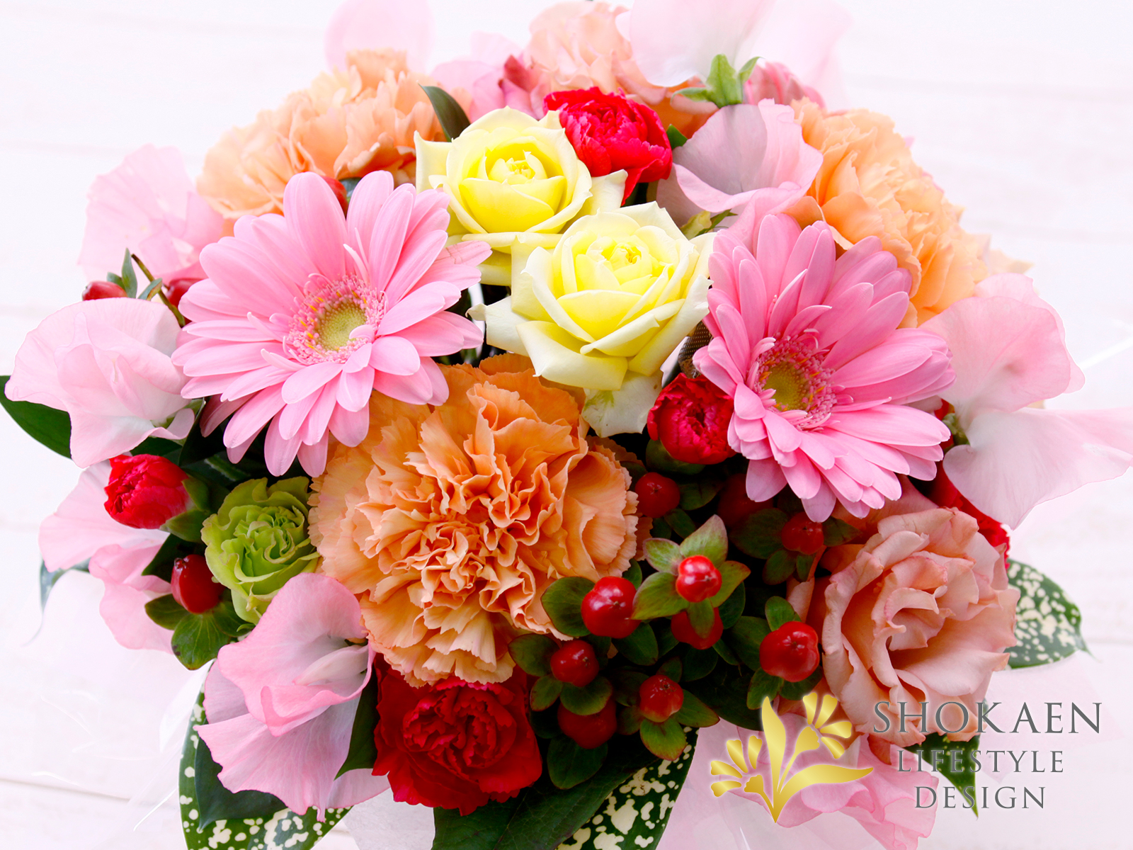 - 【石川県金沢市の花屋-正花園オリジナル】カラフルなアレンジメント。ディープオレンジのカーネーションと発色のよいピンクのガーベラをメインに可愛らしくラウンド上に仕上げました。