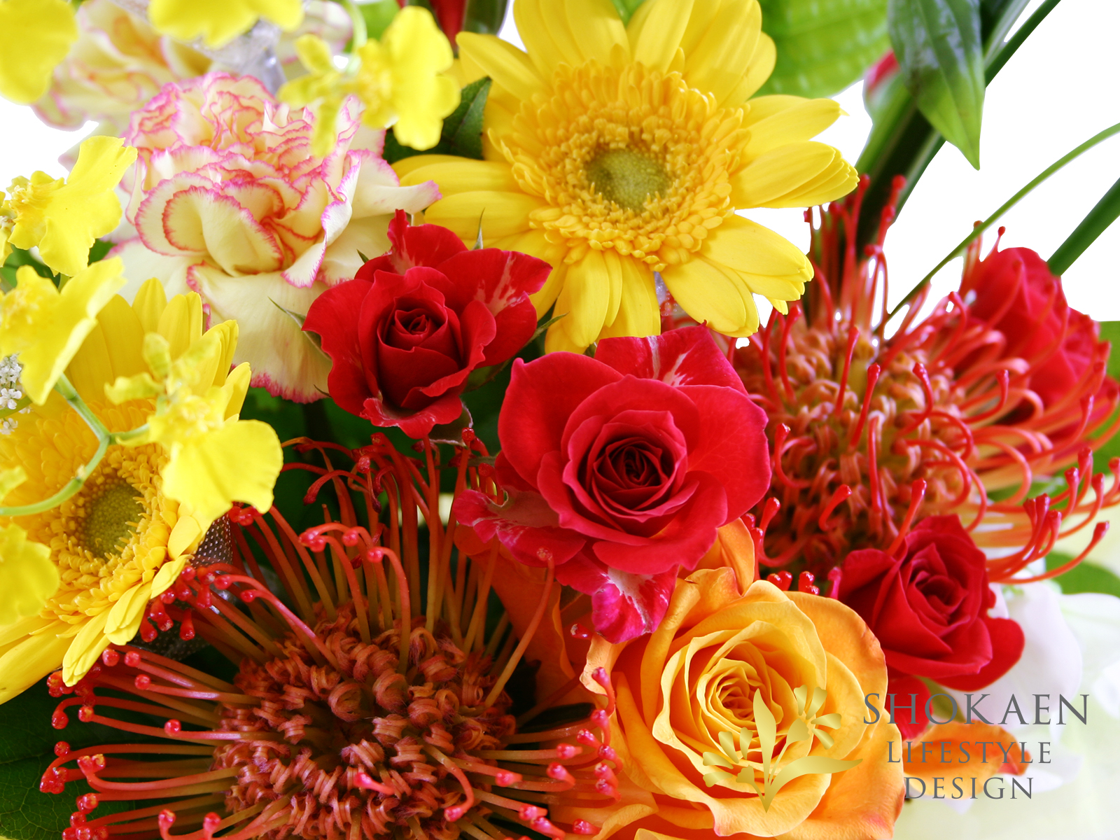- 【石川県金沢市の花屋-正花園オリジナル】黄色のガーベラを可愛らしくあしらったアレンジメントです。発色の良いオレンジ、赤色をバランスよく纏め上げ、太陽の光のように明るいアレンジメントに仕上げました。きらきら輝く眩しい作品です。