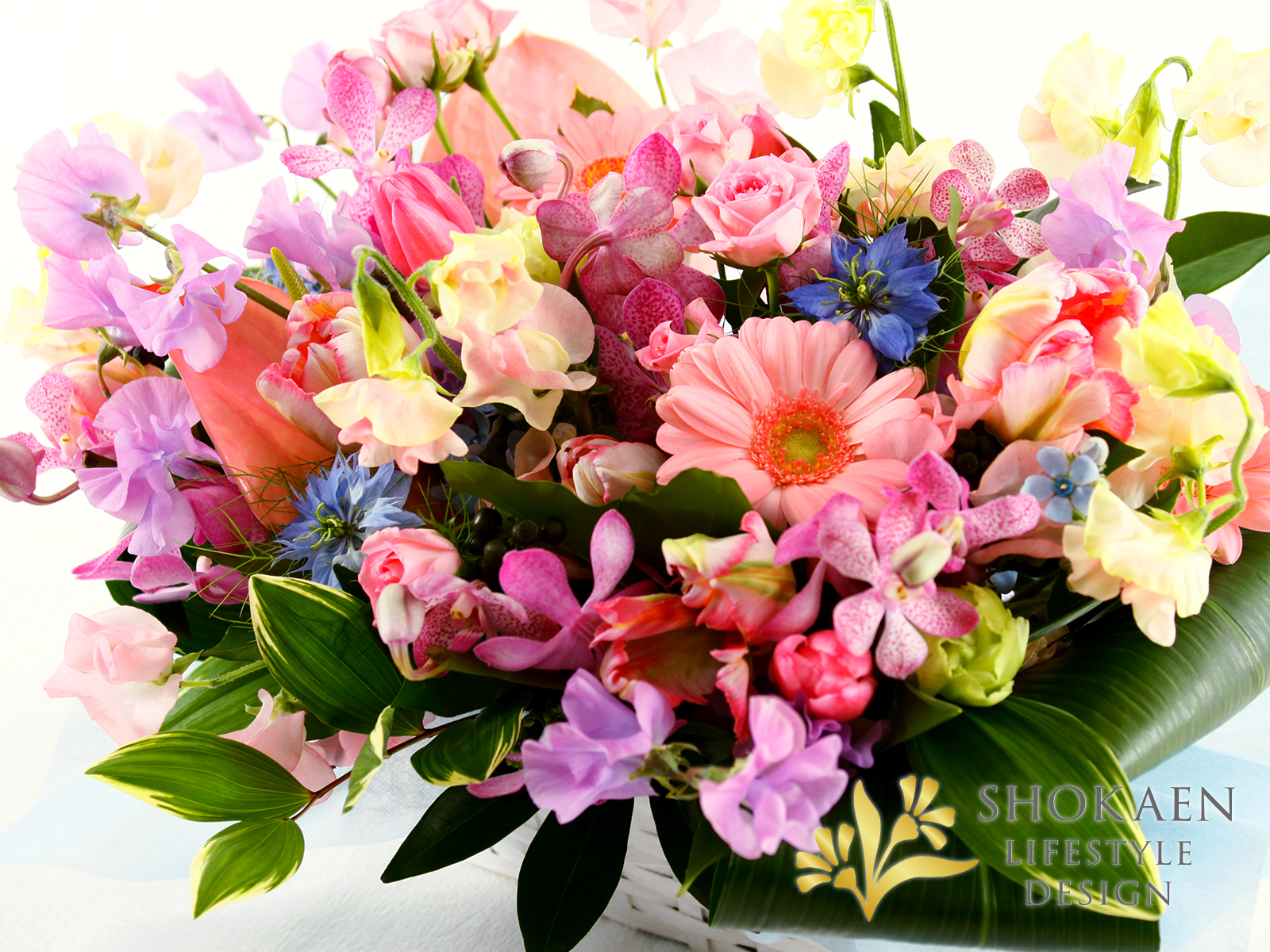 正花園のフローリスト達がデザインしたアレンジメント。お花の素材だけでなく、「飾る」までをデザインしています。