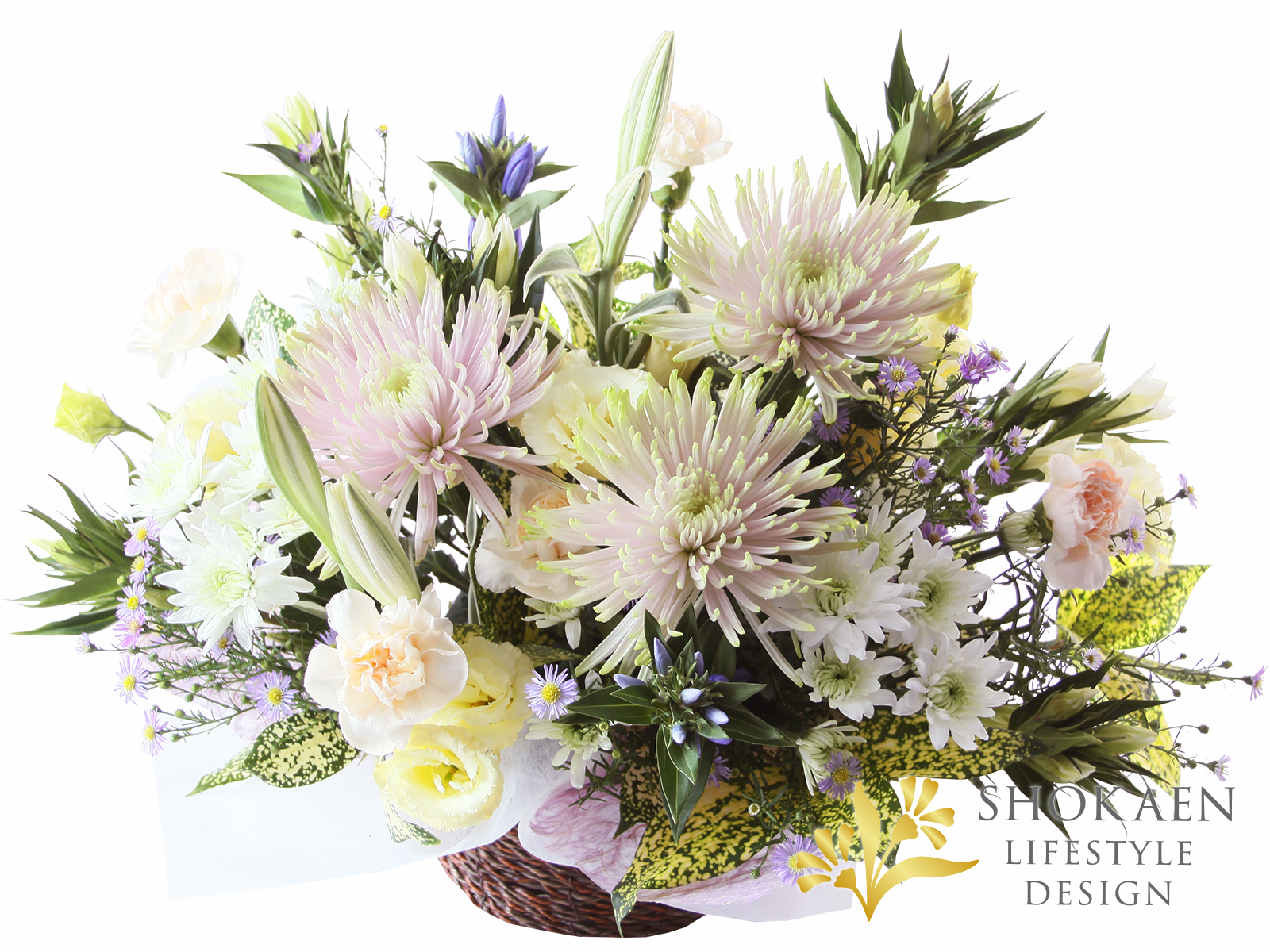 - 【石川県金沢市の花屋-正花園オリジナル】 優しいソフトな色合いを織り交ぜたお供え用アレンジメントです。