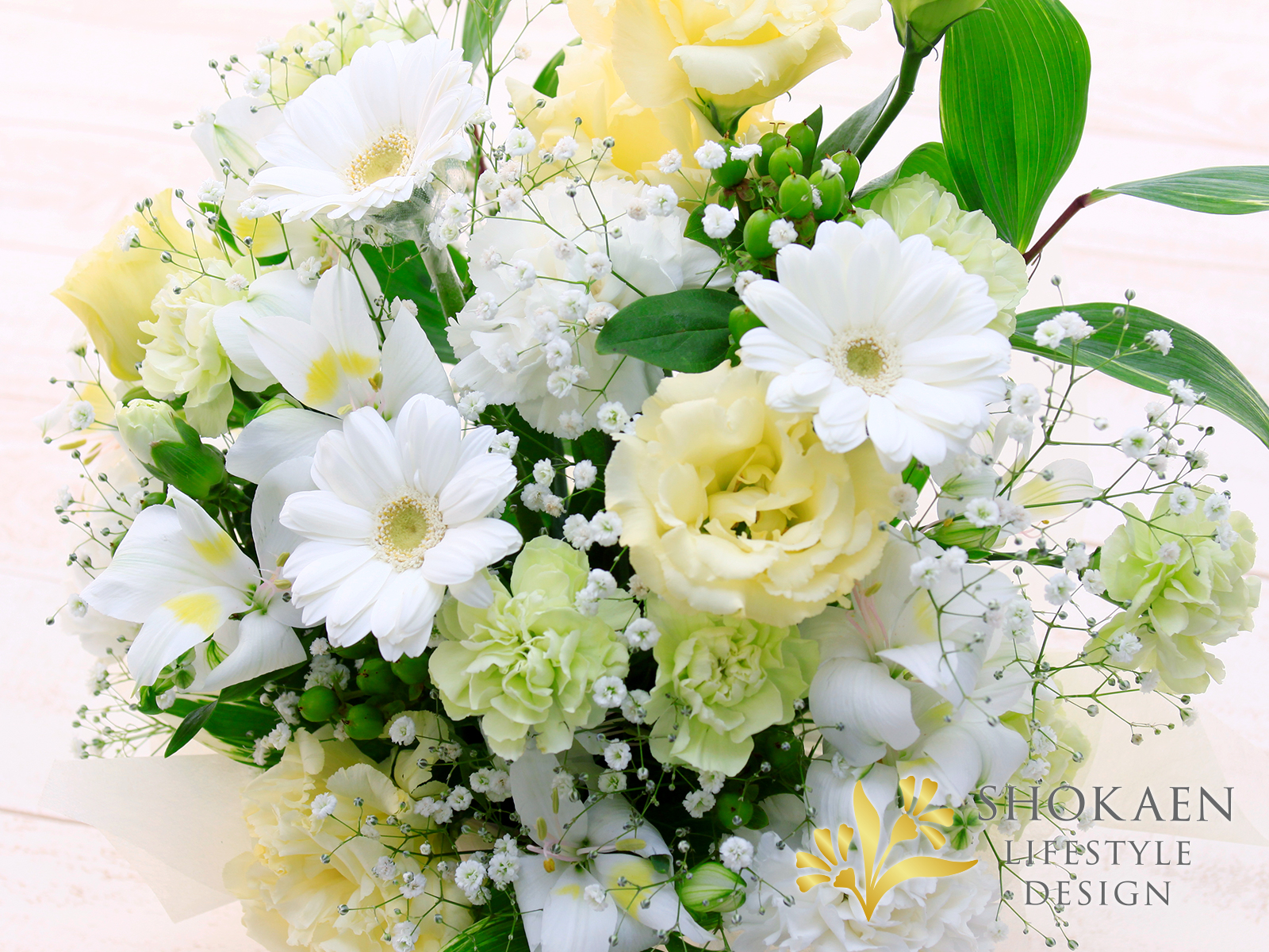 【石川県金沢市の花屋-正花園オリジナル】白を基調にクリームの小花やグリーンの小花を合わせました。優しい色合いと落ち着いた雰囲気がお供えのお花として人気です。