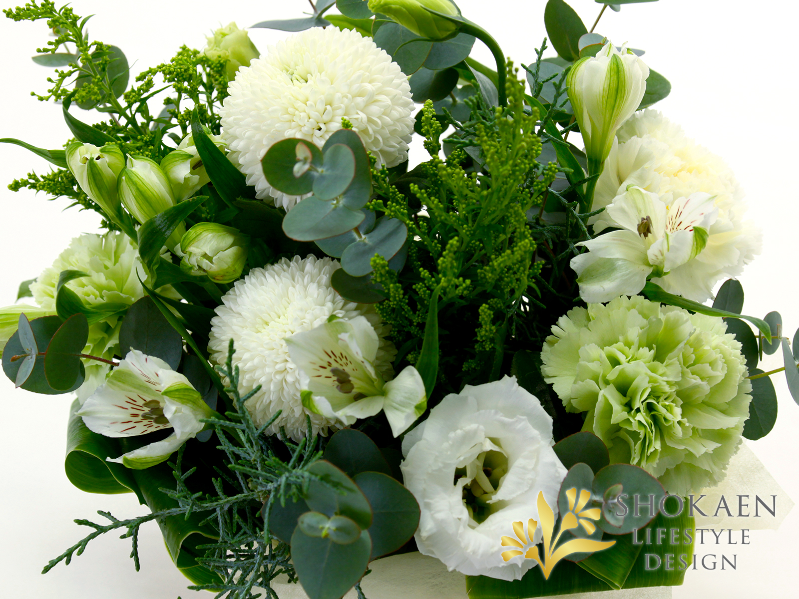 - 【石川県金沢市の花屋-正花園オリジナル】古風になりがちなお供えのお花。洋花をメインに、優しく上品なデザインに仕上げました。 白とグリーンのコントラストが明るさをいっそう引き立たせ、全体的にスッキリとしたイメージに仕上がります。