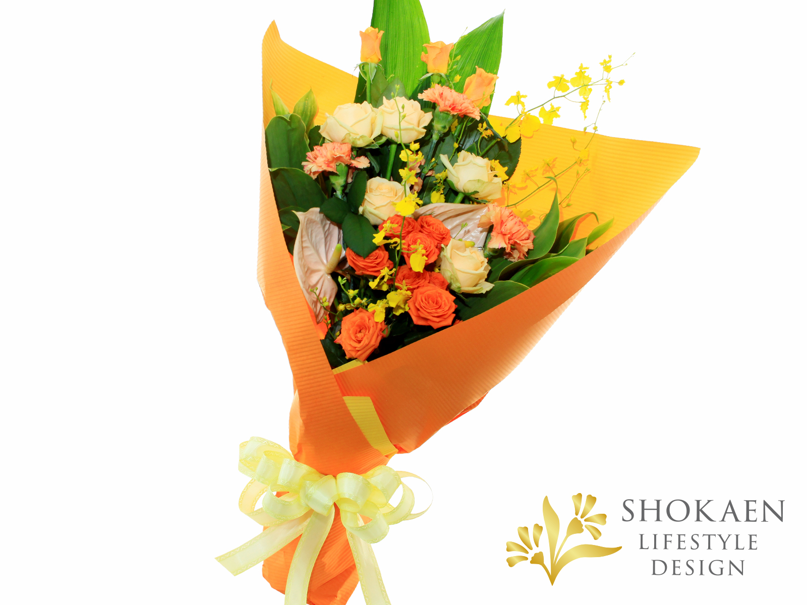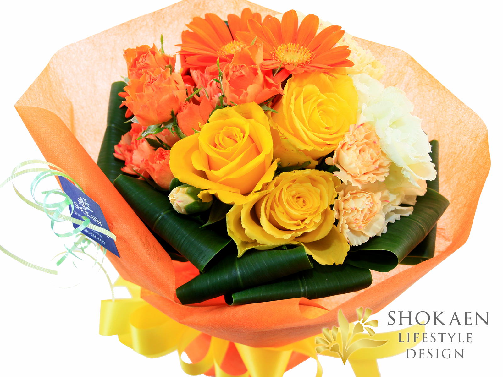 - 【石川県金沢市の花屋-正花園オリジナル】色鮮やかでビビットなイエローオレンジのお花とリーフでラウンド型ショートブーケを作りました。