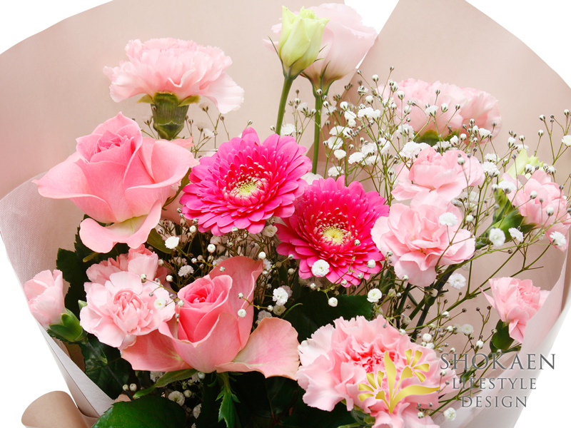 優雅なピンク色を主体とした華やかな花束です。バラやガーベラなどピンクの花々が様々なトーンで絶妙に調和し、柔らかなピンク色の強弱が美しいバランスを生み出します。薄いブラウンのラッピングペーパーで少し大人な雰囲気にも仕上げてあります。
