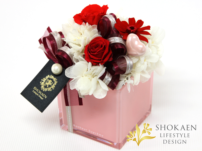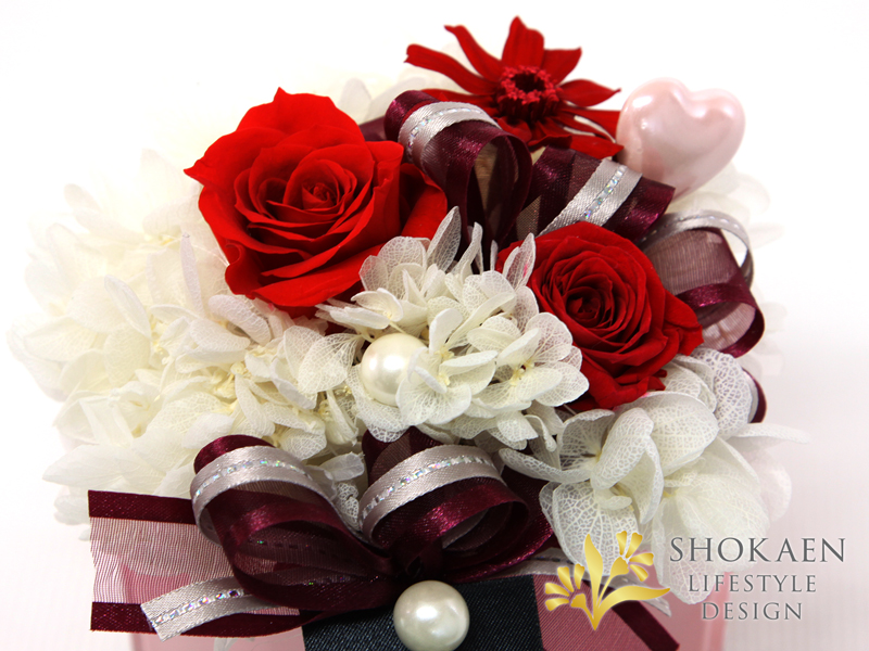 お花をたくさん詰め込んだ、プレセントボックスをイメージしたプリザーブドフラワーです。