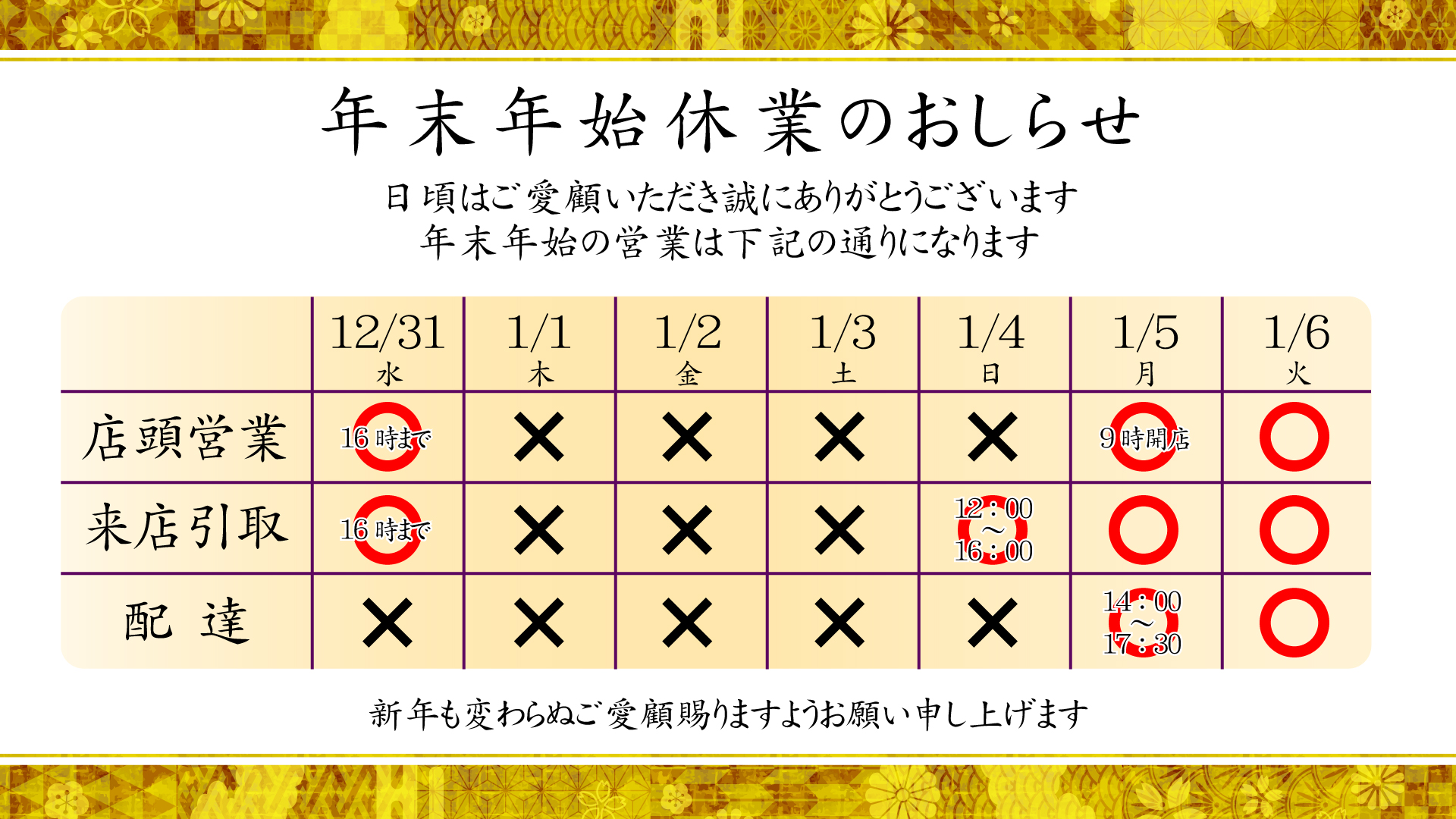 1月1日~4日までの商品の受付・予約、お届けは行っておりません。また、FAX、メール、お問合せページからのお返事も1月5日より回答を再開させていただきます。